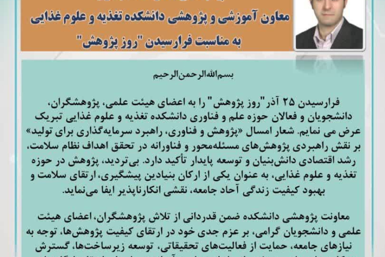 پیام تبریک آقای دکتر محمد باقرنیا معاون آموزشی و پژوهشی دانشکده بمناسبت فرارسیدن روزپژوهش 25 آذرماه 1404