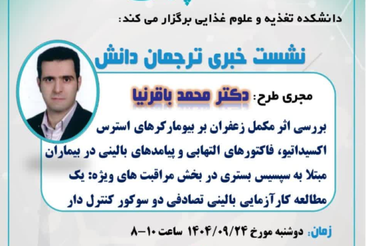 - نشست خبری بمناسبت هفته پژوهش :بررسی اثر مکمل زعفران بر بیومارکرهای استرس اکسیداتیو، فاکتورهای التهابی و پیامدهای بالینی در بیماران مبتلا به سپسیس بستری در بخش مراقبتهای ویژه مطالعه کارآزمایی بالینی تصادفی، دوسوکور و کنترلدار