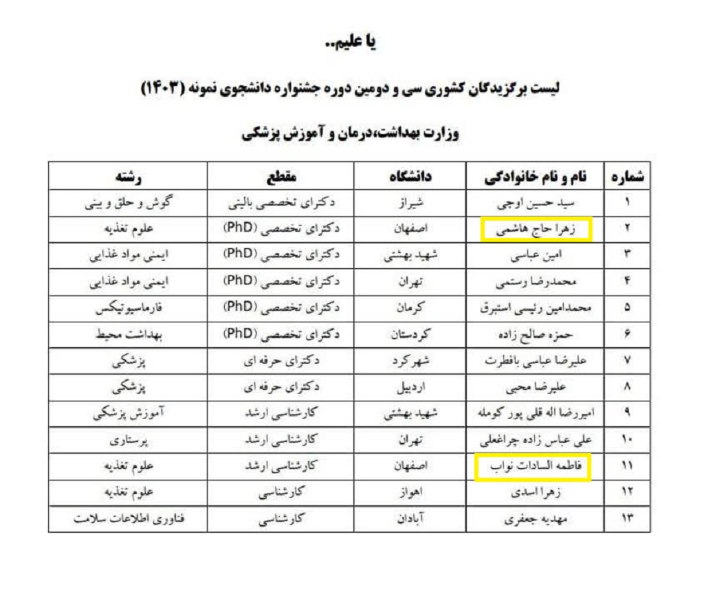 خانم زهرا حاج هاشمی و خانم فاطمه سادات نواب در سی و دومین دوره جشنواره دانشجویان نمونه، موفق به کسب عنوان ارزشمند دانشجوی برگزیده کشوری شدند.