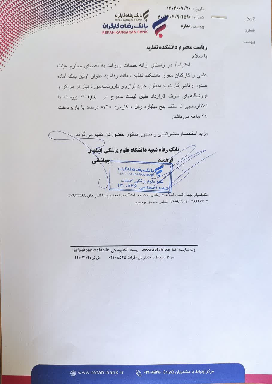 ارائه تسهیلات بانک رفاه به کارکنان و اعضای هیئت دانشگاه علوم پزشکی اصفهان جهت خرید لوازم و ملزومات مورد نیاز از مراکز و فروشگاه های طرف قرار داد ارائه تسهیلات بانک رفاه به کارکنان و اعضای هیئت دانشگاه علوم پزشکی اصفهان جهت خرید لوازم و ملزومات مورد نیاز از مراکز و فروشگاه های طرف قرار داد