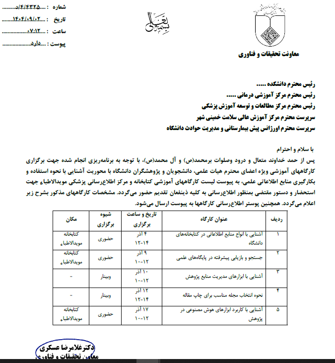 اعلام کارگاههای آموزشی کتابخانه مویدالاطباء ویژه آذرماه پژوهش 1404